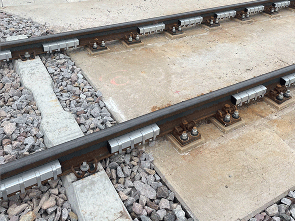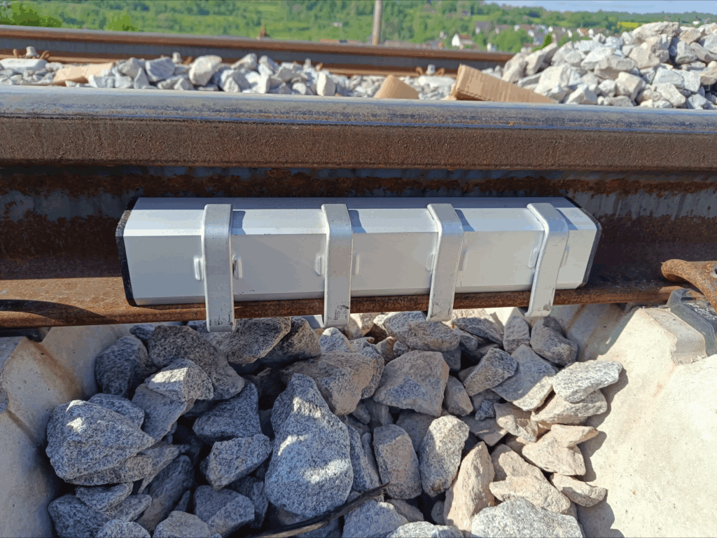 Zur Dämpfung der Schiene wird hier im Rahmen von I-LENA der Schienenstegdämpfer „CGE Noise Damper+“ erprobt. Der CGE Noise Damper+ stellt ein gemeinsames Produkt der infra-tec und der Create Green Environment (CGE) dar und soll für den Einsatz gegen Kurvenquietschen und zur Dämpfung der Schiene eingesetzt werden.
